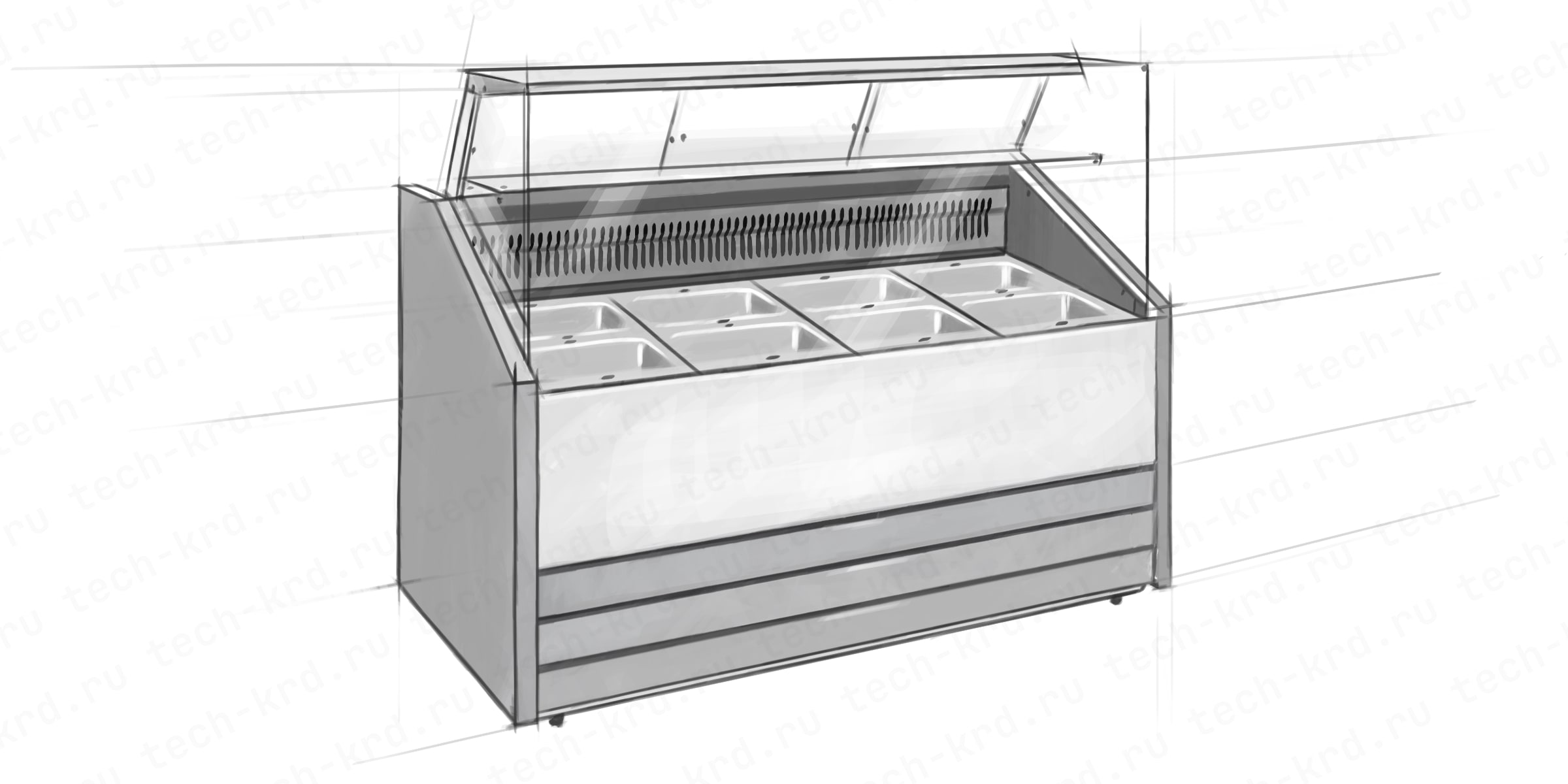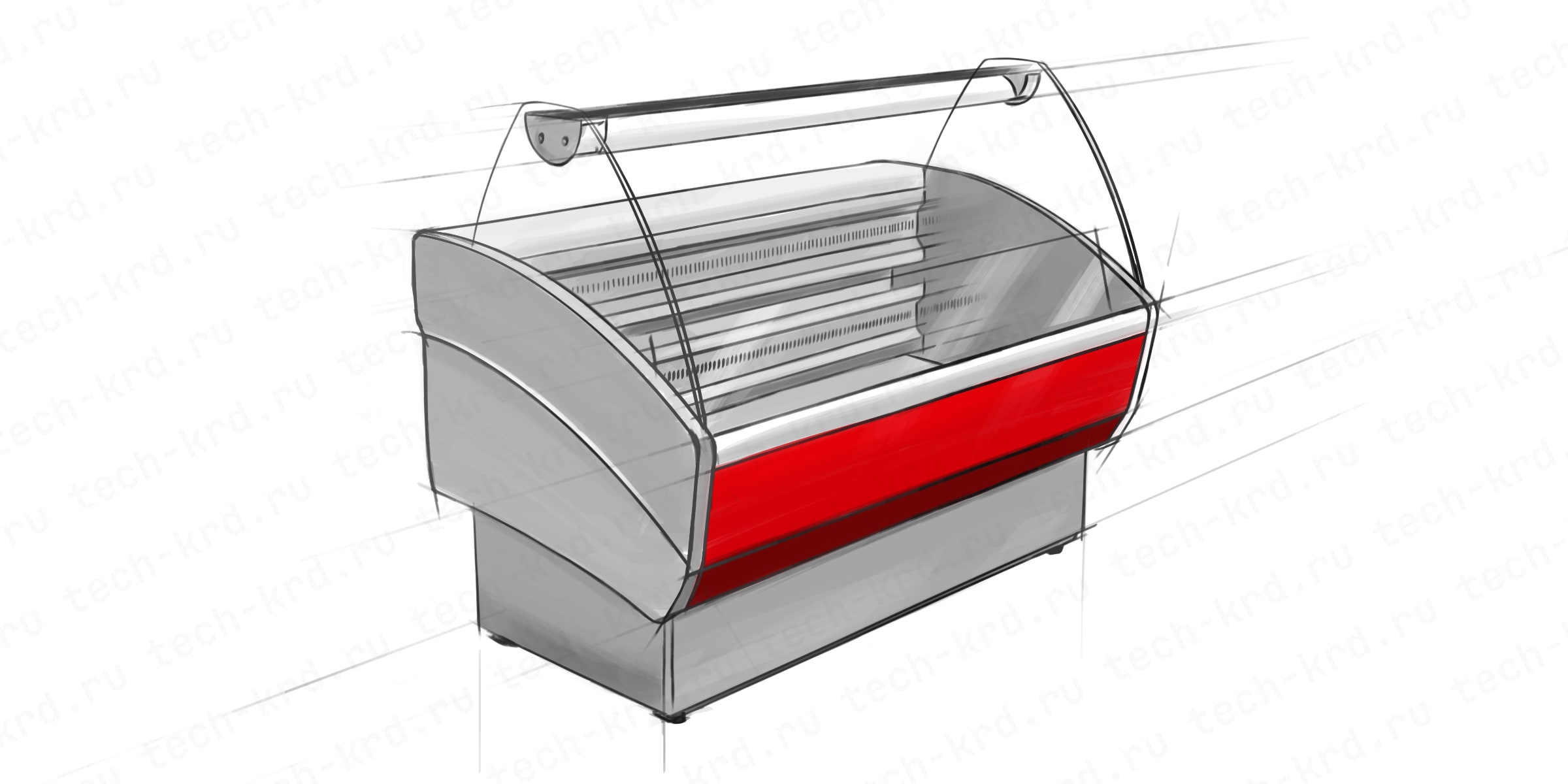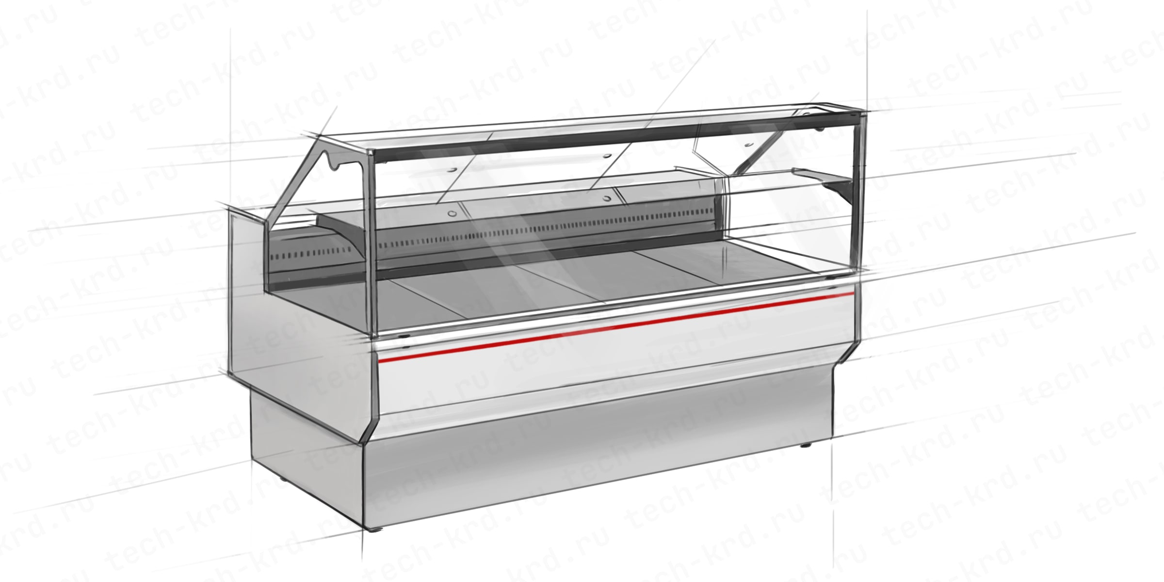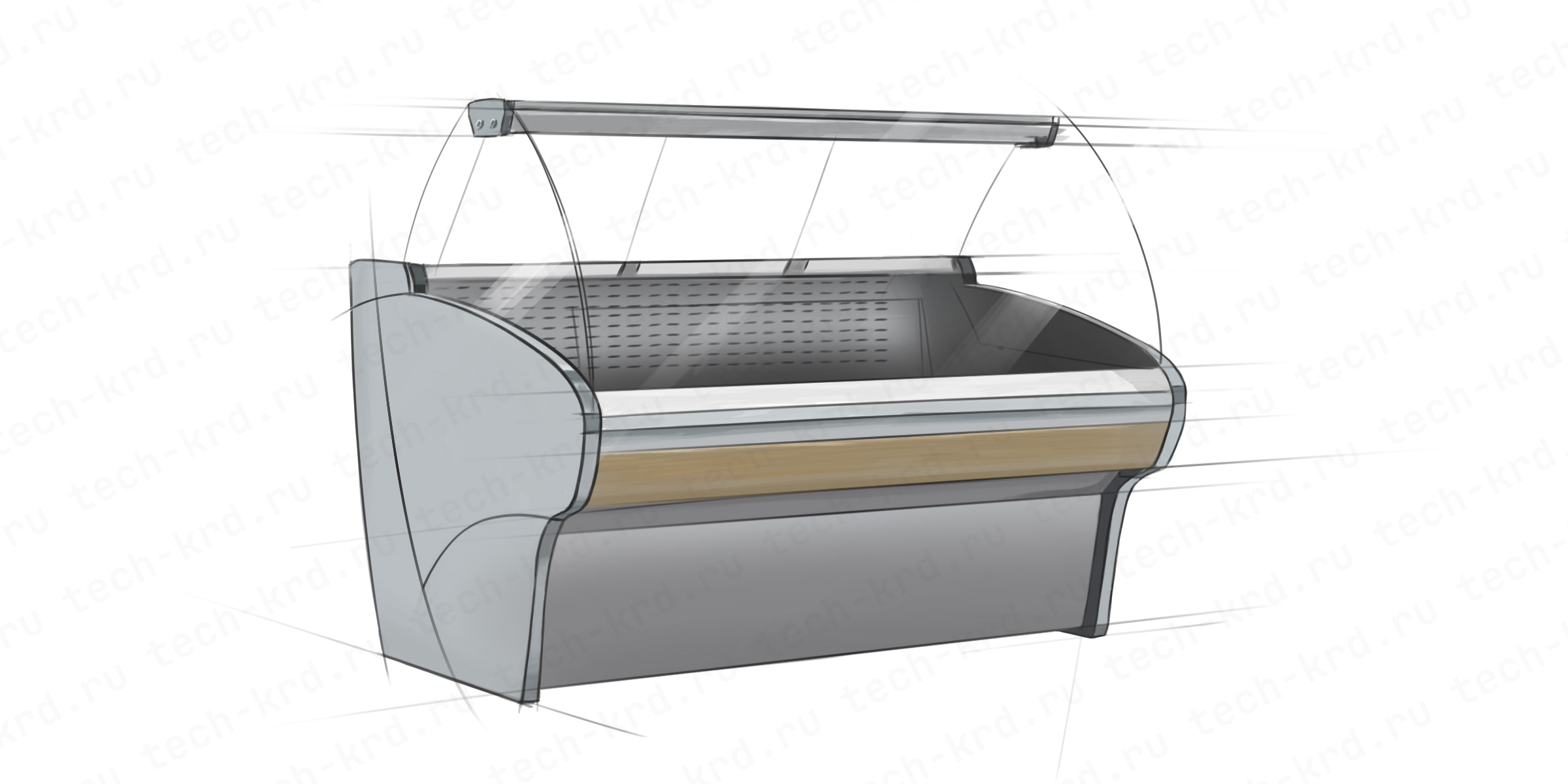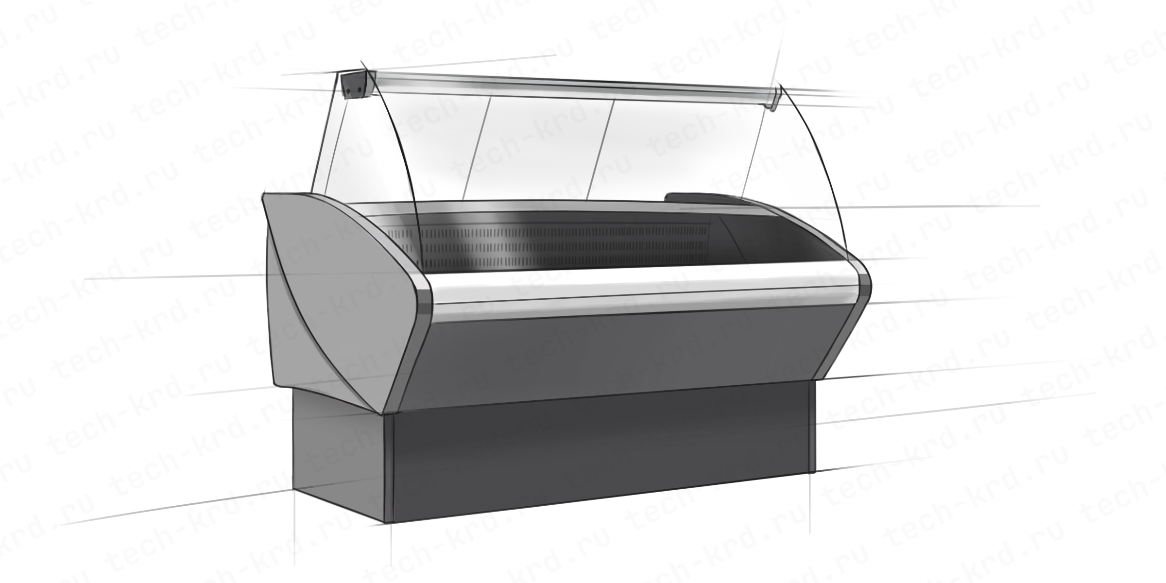Линейка витрин с гнутым стеклом и статической системой охлаждения. Корпус—стальной, зона выкладки и столешница — окрашенная оцинкованная сталь, раздвижные шторки со стороны персонала из оргстекла.