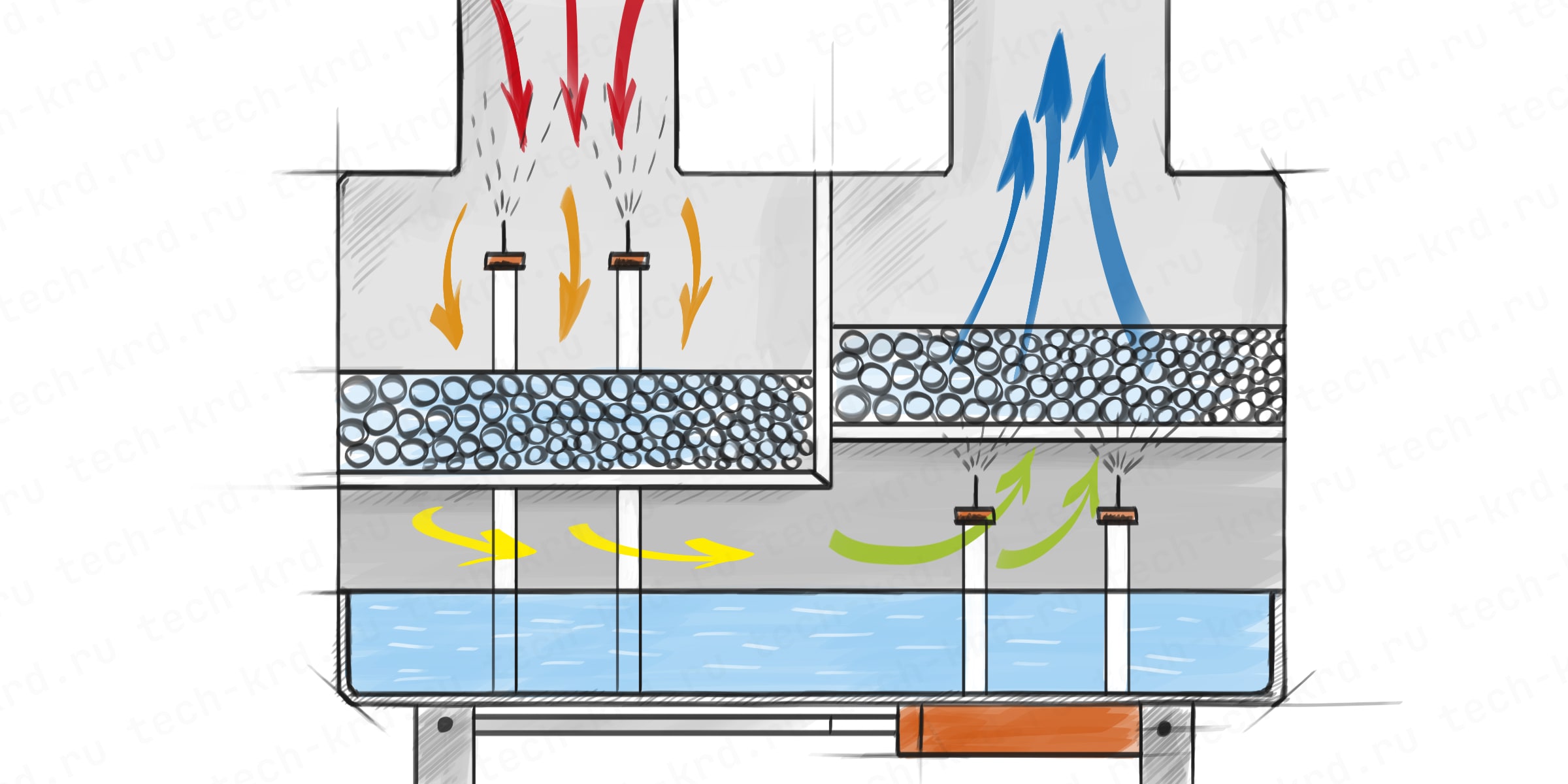 К ней подключаются трубы и насос. Внутри: в нижней части, имеется герметичная ёмкость для воды; оросительные форсунки; система фильтров с керамическим наполнением, которая представляет собой кольца с лабиринтной или круглой поверхностью. Вода внутри циркулирует автономно, по замкнутому контуру. Резервное подключение к системе водоснабжения тоже имеется. Для удобства обслуживания системы, снаружи имеется лючок для обслуживания.