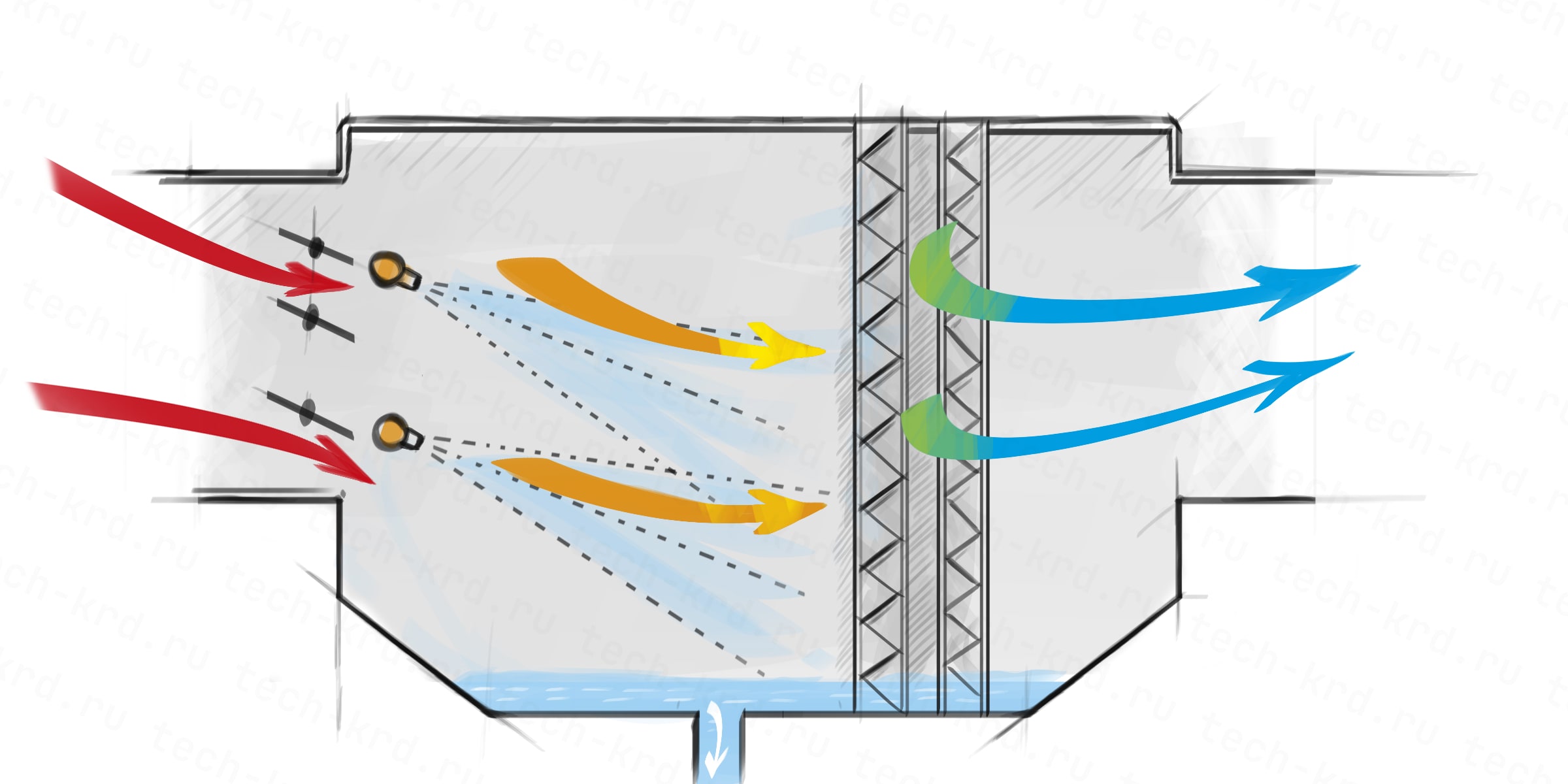 А вот принцип работы схож: вода распыляется форсунками на кассеты и входящие внутрь загрязнённый горячий воздух, сажу, искры. Внутри происходит охлаждение, воздух и загрязнения проходят через первую и вторую кассеты и вытягиваются наружу. А вода отправляется в канализацию.