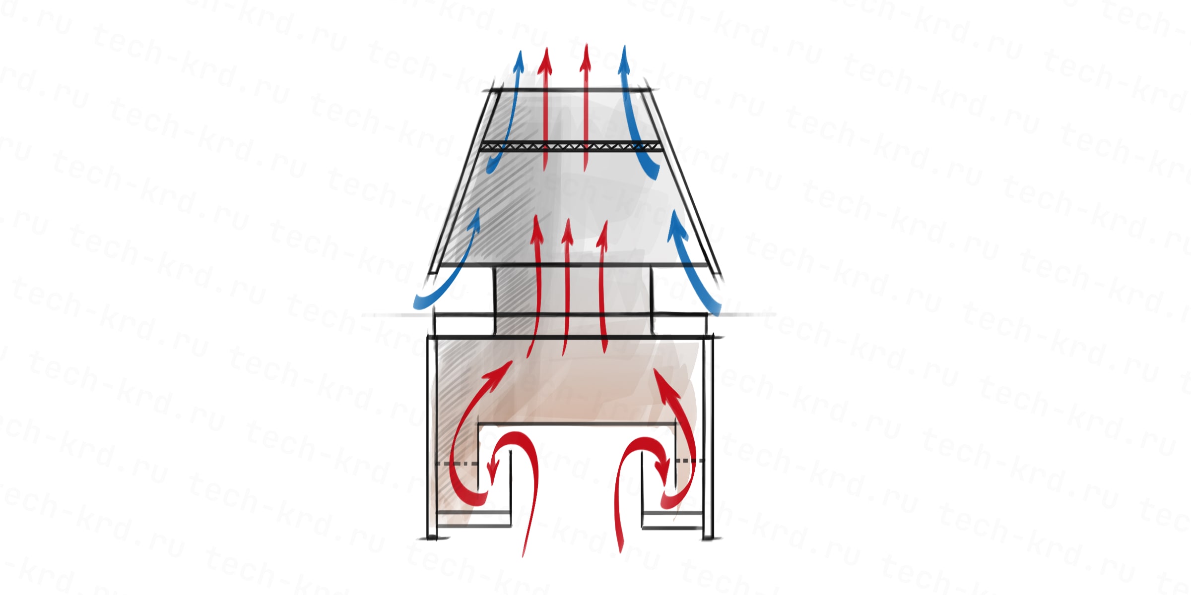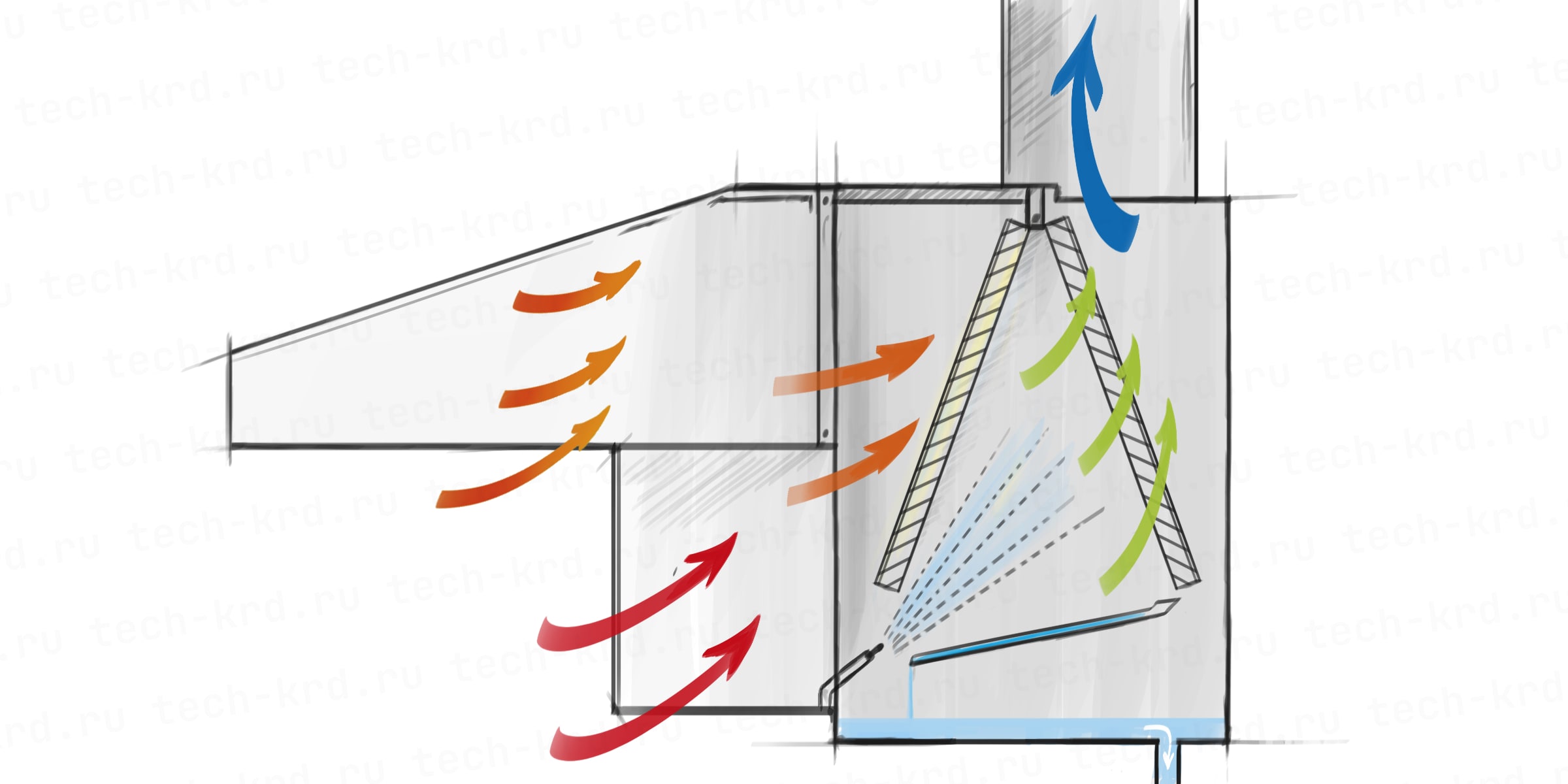 Работает также как искрогаситель проточного типа: втягиваемый воздух проходит через кассеты и водяную завесу, создаваемую форсунками, охлаждается и выводится в систему вентиляции.