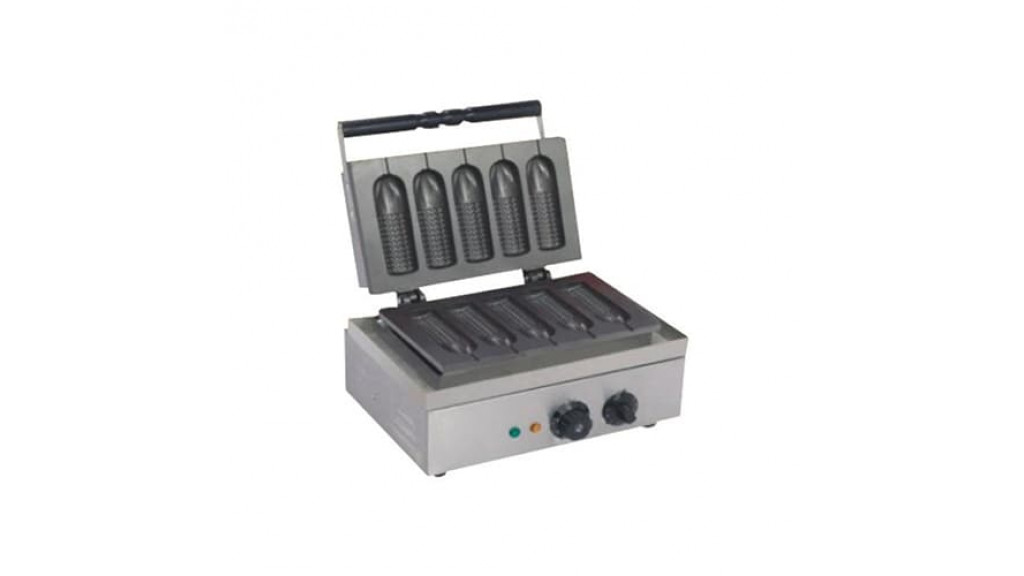Аппарат для пяти сосисок в тесте; 380 × 270 × 270 мм; корпус из нержавеющей стали; чугунные пресс-формы; 1,5 кВт.