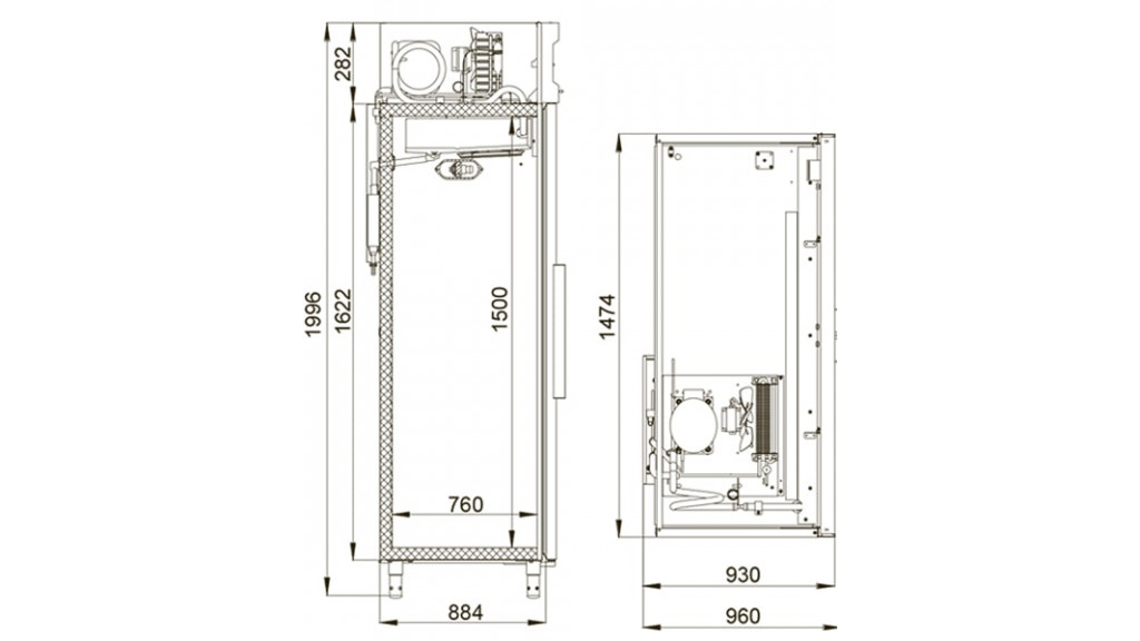 Температурный режим: не выше −18°C; объём: 1400 л; корпус из окрашенной оцинкованной стали; 230 В; 20,5 кВт·ч/сут; 1474 × 960 × 1996 мм; 212 кг.