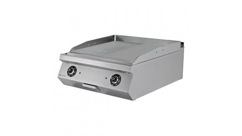 800 × 760 × 380 мм; 380 В; 8,4 кВт; 96 кг; настольная; две зоны нагрева с независимой регулировкой; комбинированная (рифлёная и гладкая) чугунная поверхность; размер поверхности 789 × 495 мм; термостат: 50…300 °C; ёмкость для сбора жира; борт для защиты от брызг.