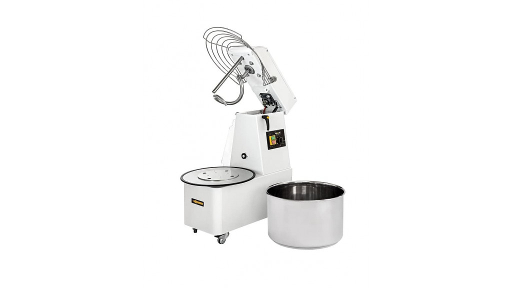 Модель оснащена четырьмя колёсами, два из которых имеют стопорные устройства. Благодаря специальной форме спирали, тесто получается однородным за считанные минуты.