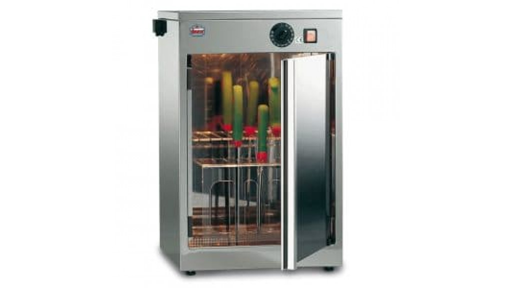 Данная модель представляет собой прямоугольный блок с камерой для размещения ножей, в которой находится подставка с нишами для размещения 20 ножей. Детали из прозрачного плексигласа легко снимаются и поддаются тщательной очистки, а также позволяют стерилизовать ножи, не переворачивая их. Внизу блока находится емкость для сбора воды. Блок закрывается герметичной дверцей из плексигласа, которая полностью закрывает камеру. Стерилизация ножей происходит при помощи 3-х ртутных ламп высокого давления UV мощностью 8 Вт каждая с защитой из металлической сетки. В качестве системы защиты выступает микровыключатель, выключающий лампы при открытии дверцы, и включающий их при закрытии, а также замок, закрывающийся на ключ. Также модель оснащена дополнительной лампой, которая включается, когда переключатель находится в положении ON.
