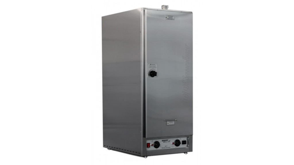Коптильня «Сиком» КР-7.150 предназначена для производства продуктов горячего и холодного копчения. Работает с любыми видами топлива, как на специальных брикетах, так и на щепе. Модель оснащена электромеханической панелью управления, терморегулятором, таймером включения ТЭНа для нагрева щепы и таймером для установки времени времени горячего копчения.