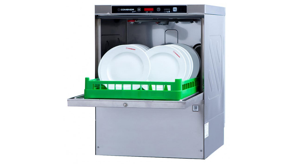 В комплект поставки входит дозатор для моющего средства, помпа слива, 2 кассеты для тарелок Comenda P18 500 х 500, кассета универсальная Comenda CB, контейнер для приборов Comenda G.
