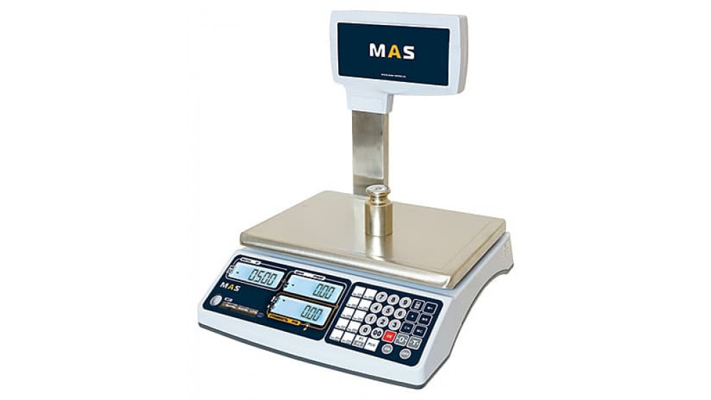 Торговые весы MAS MR1-15P используются на предприятиях общественного питания и торговли. Модель оснащена жидкокристаллическим дисплеем с размером символов 18 мм на стойке, дублирующим дисплеем для покупателя и мембранной клавиатурой.