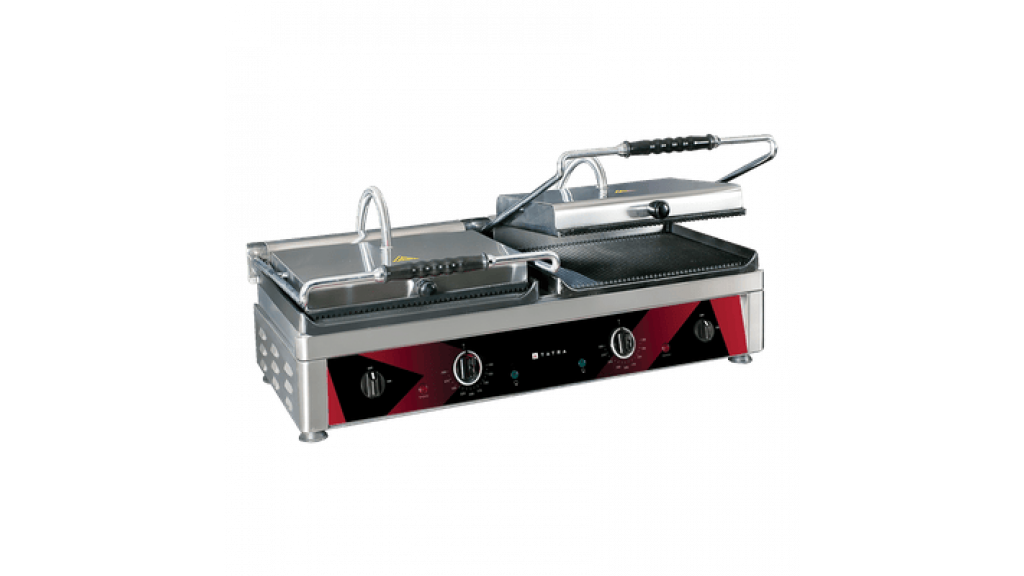 Две полностью раздельные зоны нагрева; одна половина полностью рифлёная, другая имеет рифлёный верх и гладкий низ; размер рабочей поверхности: 360 × 270 мм; материал поверхностей: чугун; темп. режим: 50–300 °C; лоток для сбора жира; 220 В; 2 × 2,5 кВт; 820 × 500 × 300 мм; масса: 56 кг.