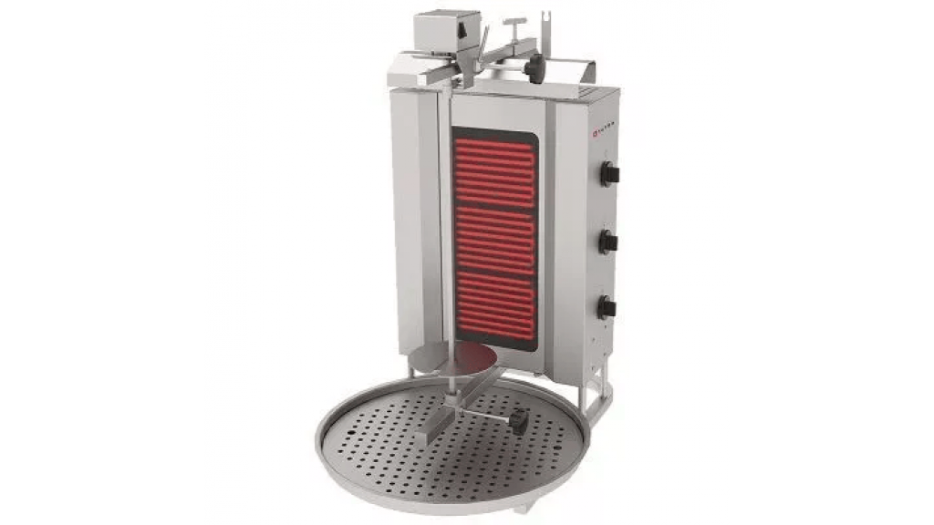Электрический гриль для шаурмы Tatra TDM E 3T применяется на профессиональных кухнях, в ресторанах, столовых, буфетах и точках фаст-фуда для приготовления мясной начинки для блюда шаурма. Модель оснащена верхним приводом вращения вертела и тремя зонами нагрева. Каждая зона нагрева имеет индивидуальное управление с двумя уровнями мощности. Привод обеспечивает вращение вертела в обе стороны. Гриль полностью изготовлен из нержавеющей стали.