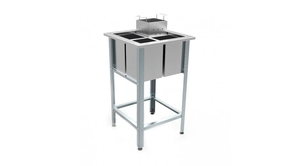 Ванна моечная для мойки яиц сварная; ёмкости (4 по 200 × 200 × 300 мм) из нерж. сталь AISI 430 каркас из уголка нерж. сталь; в комплекте: 4 сифона, 4 пробки, корзина; габариты: 530 × 530 × 870 мм.