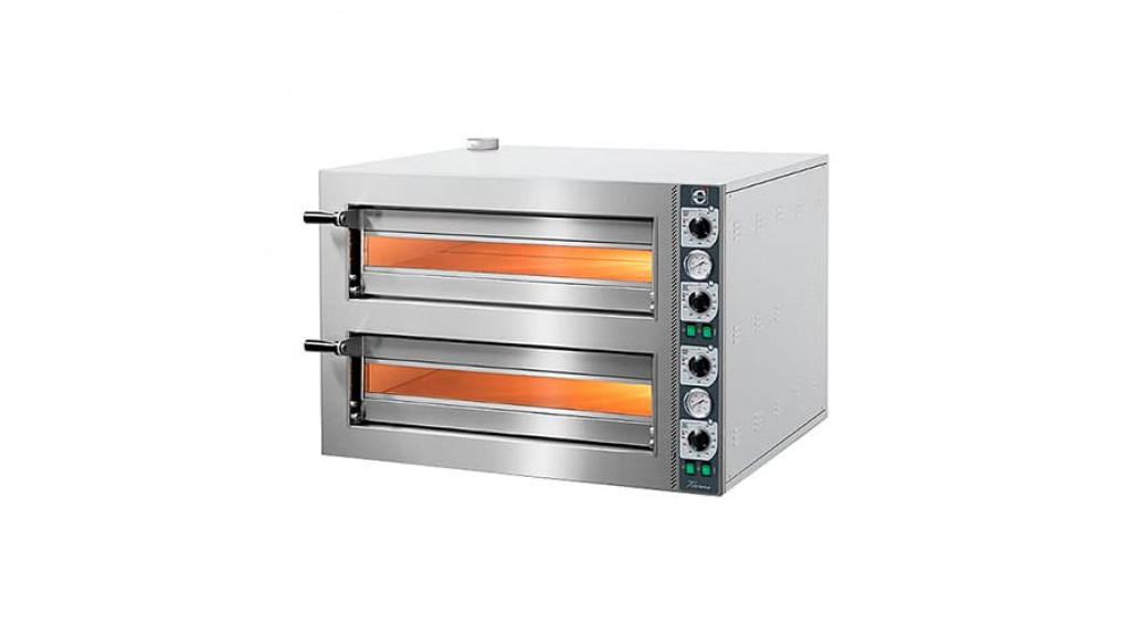1002 × 864 × 700 мм; 10,4 кВт; 380 В; размер камеры: 720 × 720 × 140 мм; вместимость: 4 + 4 пиццы ⌀ 350 мм или 1 + 1 пицца ⌀ 500 мм; двухкамерная моноблочная печь