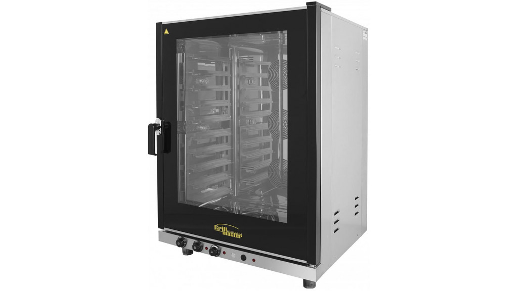 Электрическая печь; 380 В; 16,2 кВт; электромеханическое управление; 10 уровней (80 мм между уровнями); противни 600 × 400 мм, гастроёмкости GN 1/1; темп. режим: 50–300 °C; настольная установка; пароувлажнение; подключение к водопроводу; габариты (ш × г × в): 850 × 840 × 1200 мм; масса (без упаковки): 138 кг.