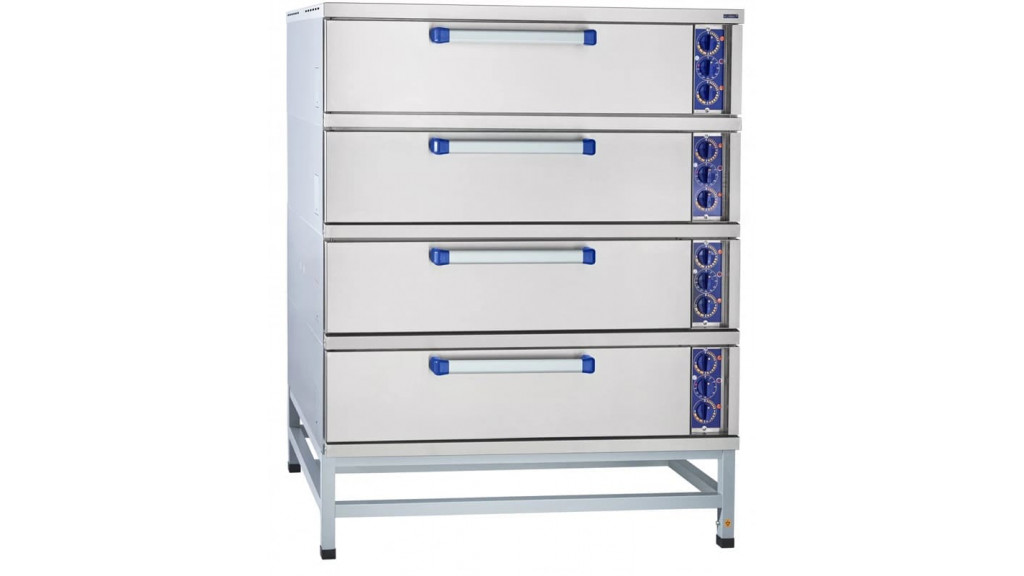 1300 × 1080 × 1680 мм; Шкаф пекарский подовый ЭШ-4К электрический, 4 пекарные камеры: 1000 × 800 × 180 мм; нержавеющие ТЭН-ы, раздельная регулировка верхних и нижних ТЭН-ов (+20 ... +270 С), нержавеющая облицовка, нержавеющие дверцы, крашеные боковые и задняя стенки.