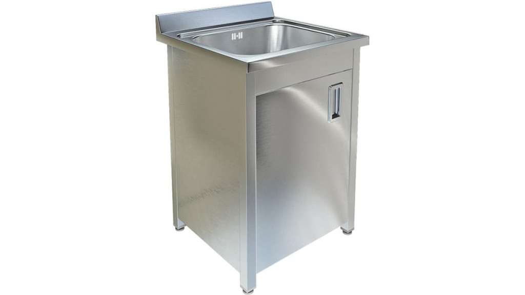 Стальная цельнотянутая ванна AISI 304; каркас сварной из стали AISI 430, толщина 1,2 мм; рабочая поверхность из нержавеющей стали AISI 304, толщиной 1 мм; плоский борт 70 мм; 600 × 600 × 850 мм, 25 кг.