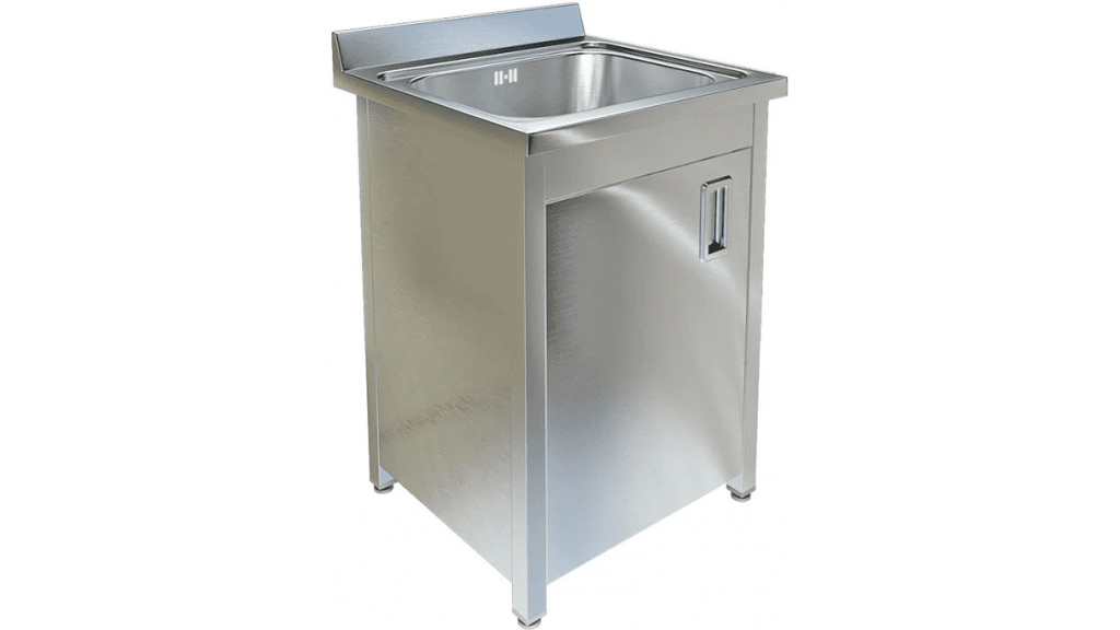 Стальная цельнотянутая ванна AISI 304; каркас сварной из стали AISI 430, толщина 1,2 мм; рабочая поверхность из нержавеющей стали AISI 304, толщиной 1 мм; плоский борт 70 мм; 600 × 700 × 850 мм.