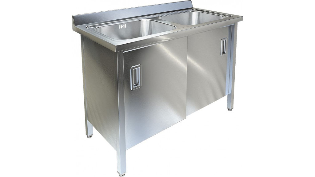 Каркас изготовлен из нержавеющей стали толщиной 1,2 мм марки AISI 430. Раздвижные дверцы "купе" позволяют сэкономить пространство кухни при их открытии. Ножки ванны снабжены регуляторами высоты, что позволяет устранить неровности пола. Ванны комплектуются сифоном с переливом, нержавеющим выпуском с решеткой диаметром 90 мм, диаметр выходного отверстия в сифоне 50 мм.
