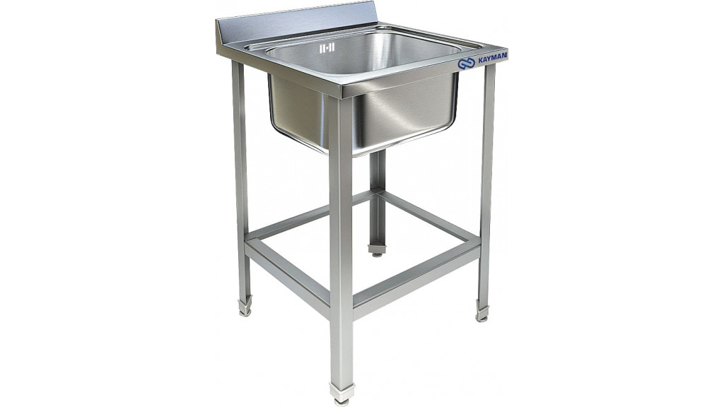 Стальная цельнотянутая ванна AISI 304; каркас уголок из нержавеющей стали AISI 430 толщиной 1,5 мм; рабочая поверхность из нержавеющей стали AISI 304, толщиной 1 мм; плоский борт 70 мм; обвязка; 600 × 600 × 850 мм.