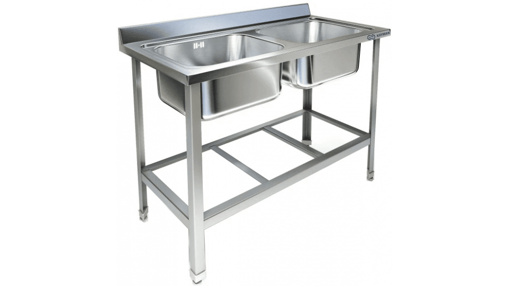 Разборный каркас из оцинкованного уголка, толщиной 1,5 мм; рабочая поверхность из нержавеющей стали AISI 304, толщиной 1 мм. В комплекте: 2 сифона и 2 выпуска с решеткой.