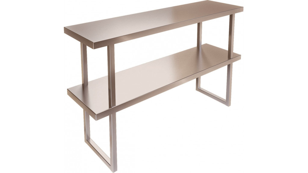 1600 × 300 × 800 Полка настольная для столов со столешницей ЛДСП разборная из нержавеющей стали марки AISI 430 толщиной 0,8 мм; с усилителем, 2 яруса. Боковины (стойки) из трубы 20 × 20 нержавеющей стали марки AISI 430 толщиной 1,2мм. Крепление к столу болтовое