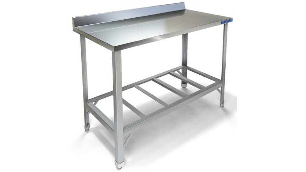 Столешница стола выполнена из нержавеющей стали AISI 304. В конструкции столешницы предусмотрены специальные вкладки из ДСП, которые значительно понижают количество шума появляющегося при работе со столом. Материал столешницы делает ее устойчивой к царапинам и механическим повреждениям, позволяя обрабатывать продукты прямо на ее поверхности. Стол предназначен для установки вплотную к стене. Задняя часть столешницы оборудована бортиком высотой 100 мм, препятствующим попаданию на стену воды и частей продуктов.
