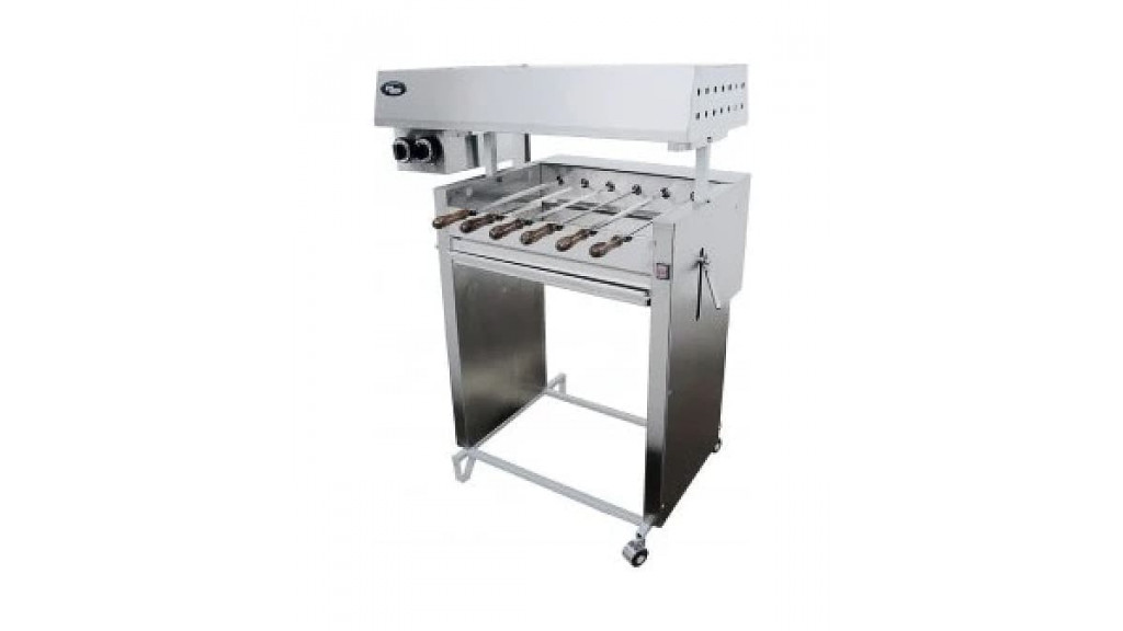 900 × 600 × 1190 мм; 6 шампуров; подъемная крыша для регулировки степени тепловой обработки продуктов; 2 газовых крана с системой газ-контроль для защиты от утечек газа; плавная регулировка интенсивности горелок; электропривод всех шампуров.