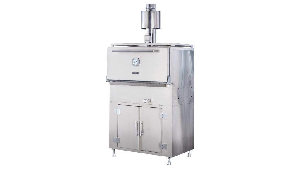903 × 760 × 1370 мм; рабочая температура: до 500 °С; идеально подходит для приготовления вкуснейших блюд в ресторанах от 20 до 200 посадочных мест; регулировка поддува выведена наружу; стандартная комплектация: верхняя шиберная заслонка, нижний регулятор тяги воздуха, нижний встроенный шкаф подставка, ящик для сбора золы, комплект колосников, термометр, одна гриль-решетка, лоток.