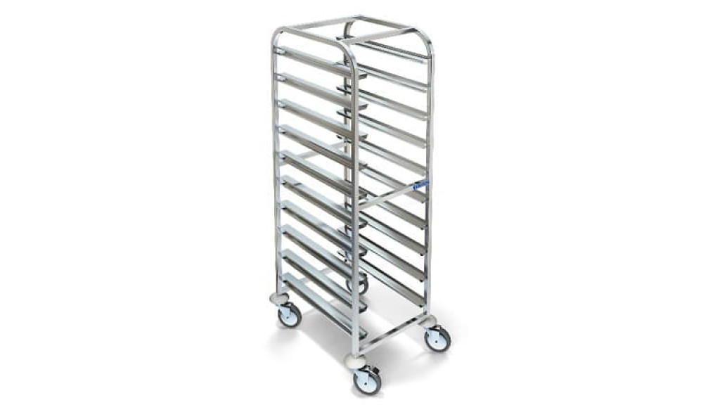 Стеллаж имеет сварную конструкцию из профильной трубы. Состоит из 10 уровней для транспортировки 10 противней размеров 600мм (ширина), 400 мм (длина). Сварные трубы выполнены из нержавеющей стали AISI 304 и позволяют устойчиво установить стеллаж на полу с помощью 4-х поворотных колесиков с блокировкой диаметром 125 мм. Колесики обеспечивают легкость и простоту передвижения стеллажа по рабочим площадям.