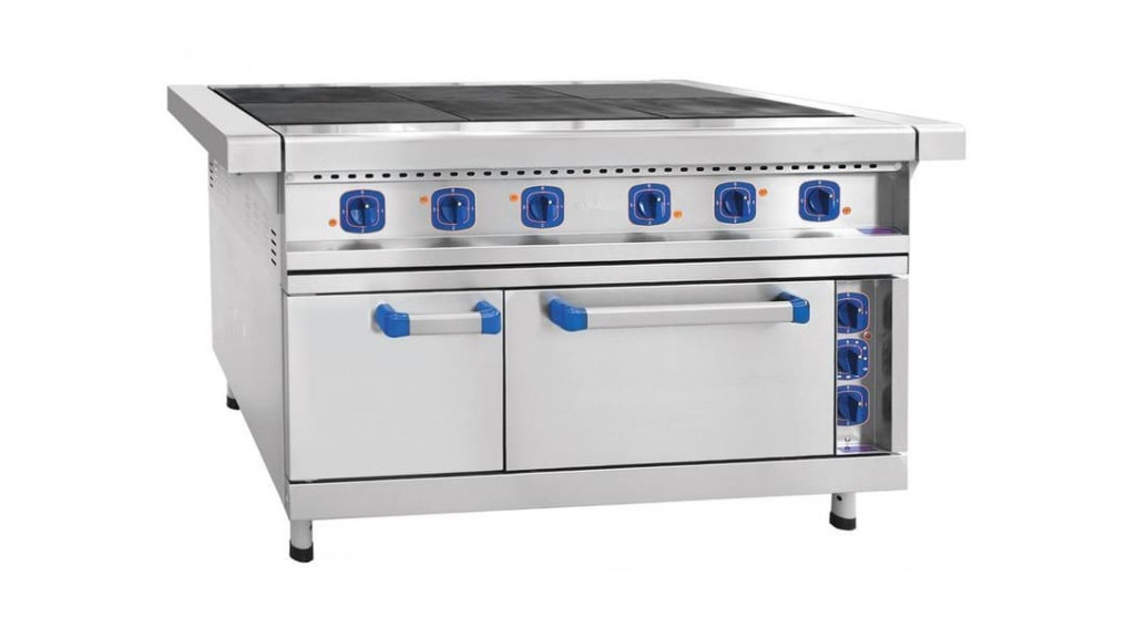 1355 × 933 × 860 мм; плита электрическая ЭП-6ЖШ-К-2/1, 6 конфорок, КЭТ-0,12, духовка GN 2/1, конвекция; пароувлажнение; полностью из нержавеющей стали.