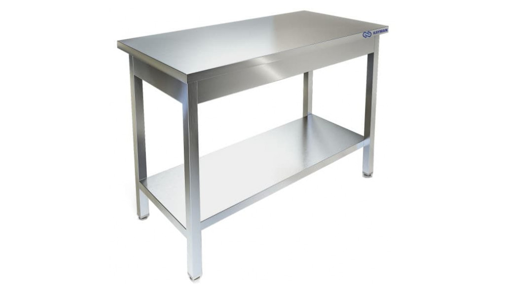 Каркас стола из трубы нержавеющей стали AISI 430 толщиной 1,2 мм, столешница из AISI 430 без борта с усилением из ЛДСП толщиной 16 мм, внизу полка.
