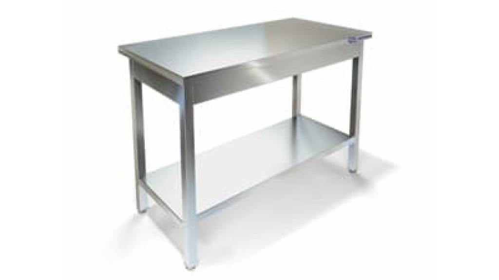 1800 × 700 × 850, каркас разборный из нержавеющей трубы 40 × 40 мм (AISI 430, толщина стенки 1,2 мм); полка-сплошная, рабочая поверхность AISI 430, толщиной 0,8 мм; усиление ЛДСП 16 мм;, 0,4V, м3