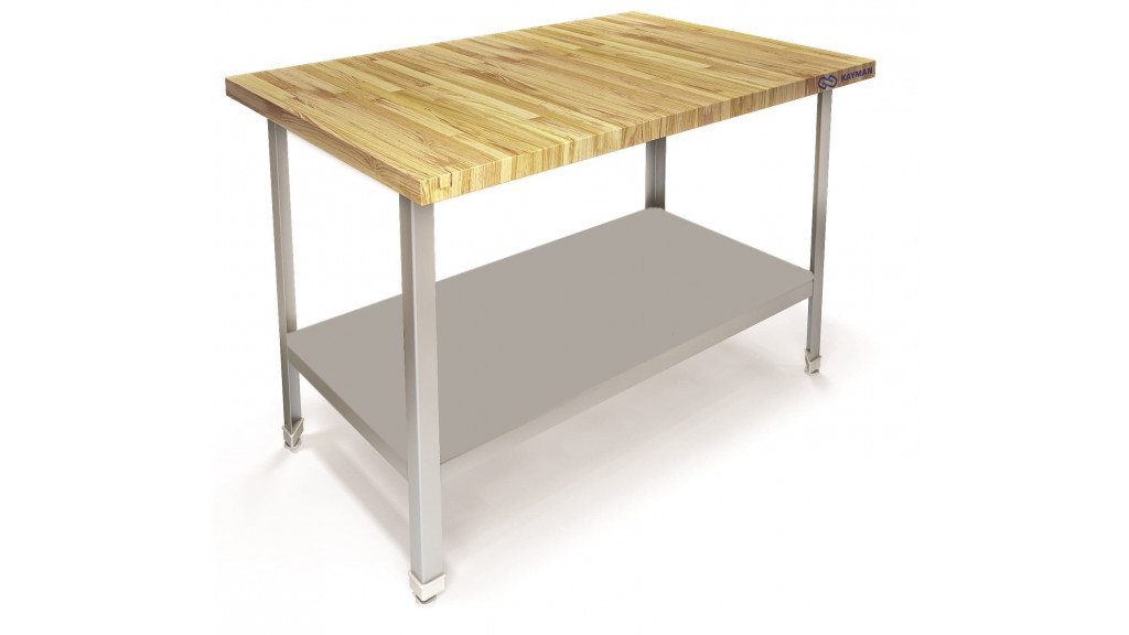 1500 × 800 × 875, разборный каркас из нержавеющего уголка толщиной 1,5 мм (сталь AISI 430); спрлошная полка-накладка из нержавеющей стали AISI 430, толщиной 0,5 мм; бук H=40 мм. V, м3