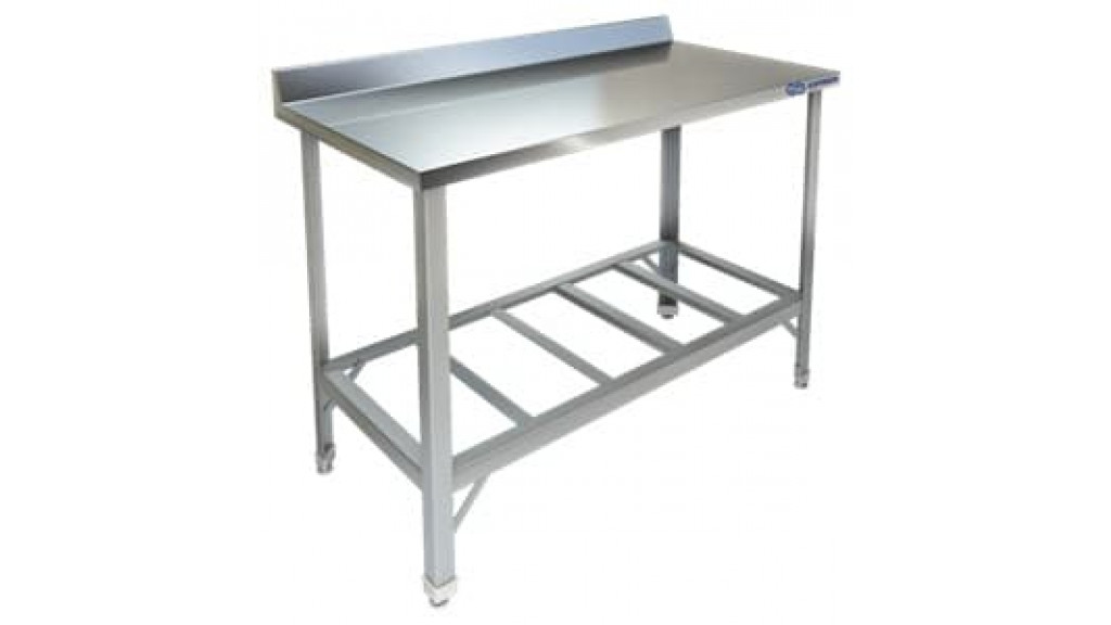Данный стол базируется на каркасе из оцинкованного металла, столешница из нержавеющего металла AISI 430, толщиной 8 мм, с бортом. Внизу полка решетка из оцинкованной стали.