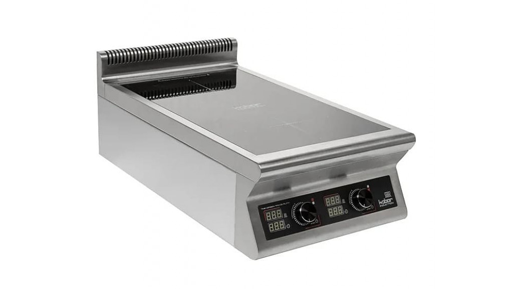 400 × 700 × 260 мм; плита индукционная настольная; 2 конфорки мощностью 2 × 3,5 кВт; электронная панель управления с цифровой индикацией, 13 уровней нагрева, таймер до 180 минут, съемный жировой фильтр, корпус из нержавеющей стали AISI 304, регулируемые по высоте ножки.