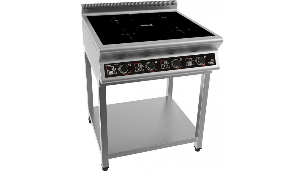 700 × 700 × 870 мм, индукционная на открытой подставке, 4 конфорки мощностью 4 × 3,5 кВт; электронная панель управления с цифровой индикацией, 13 уровней нагрева, таймер до 18 0мин., съемный жировой фильтр