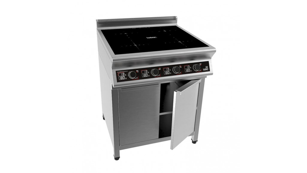 700 × 700 × 870 мм, плита индукционная на закрытой подставке, 4 конфорки мощностью 4 × 3,5 кВт; электронная панель управления с цифровой индикацией, 13 уровней нагрева, таймер до 180 мин, съемный жировой фильтр, корпус из нержавеющей стали AISI 304, регулируемые по высоте ножки.