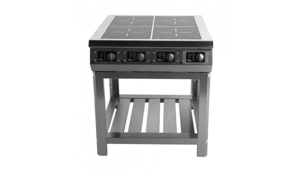 800 × 800 × 882 мм; подставка полностью из нержавеющей стали; электрическая, индукционная, четыре зоны нагрева; размер конфорки 320 × 340 мм; сенсорное и механическое управление с ЖК-дисплеем, увеличенная в диаметре катушка, 10 уровней мощности.