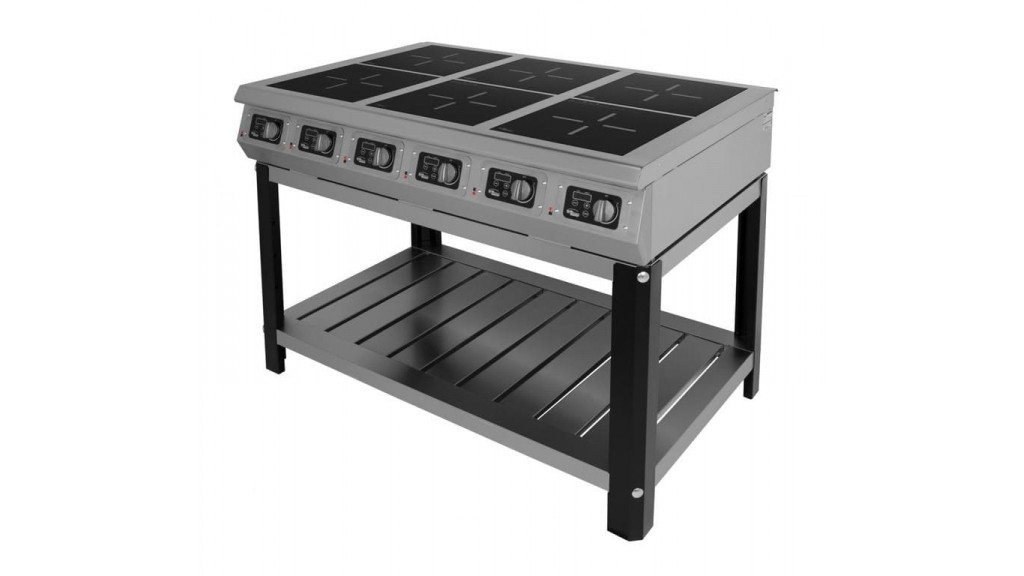 1178 × 817 × 882 мм; электрическая индукционная плита, 6 зон нагрева, размер конфорки 320 × 340 мм; сенсорное и механическое управление с ЖК-дисплеем, увеличенная в диаметре катушка, 10 уровней мощности, мощность: 1 зоны 3,5 кВт; электронный таймер 0 … 24 ч.