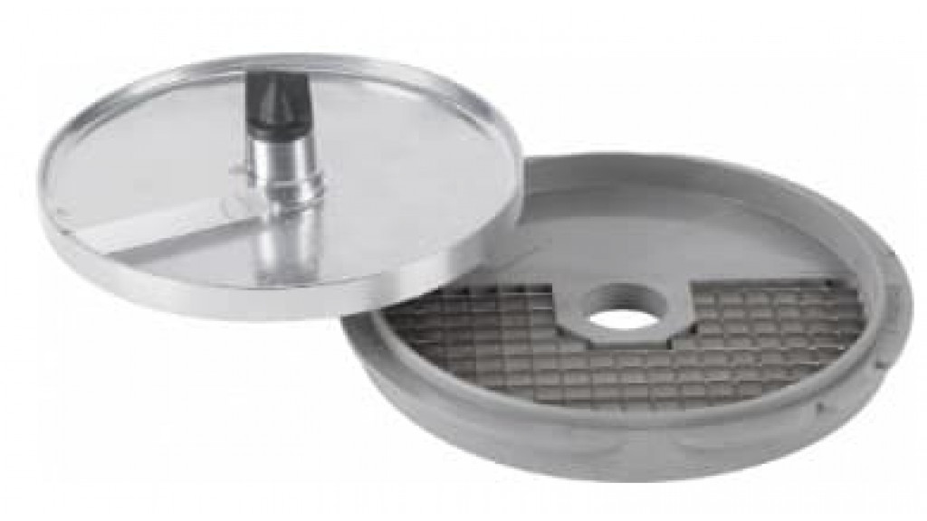 комплект 27114W: диск 29334 + решётка 102065, Устанавливается в рабочий отсек овощереки на вал двигателя, используется для моделей CL30/CL40/R402, изготовлен из нержавеющей стали.Используется для нарезки картофеля, моркови, кабачков, свеклы, репы на куби