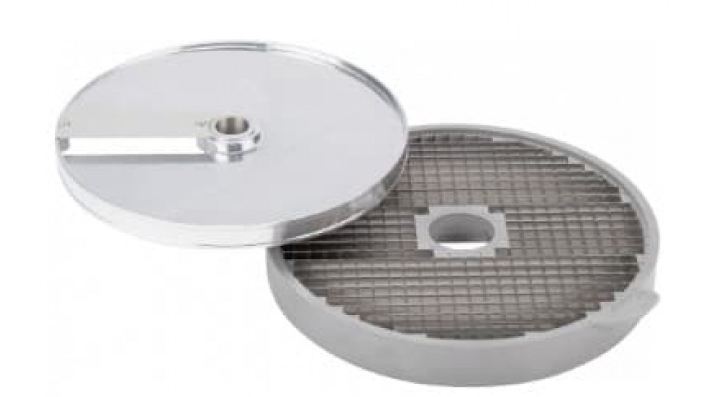 комплект 28111: диск 28129 + решётка 28118, Устанавливается в рабочий отсек овощереки на вал двигателя, используется для моделей CL50/52/55/60/R502/R602, изготовлен из алюминия Используется для нарезки картофеля, моркови, кабачков, свеклы на кубики разм