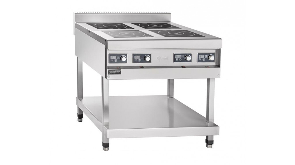 840 × 900 × 940 мм; плита индукционная 4-х конфорочная КИП-49П-3,5…01, нержавеющая сталь, 9 уровней мощности, +60 … +240 С, 14 кВт; 380 В; 4 независимых индуктора, стеклокерамика 6 мм; 2 жироулавливающих фильтра, защита от перегрева.