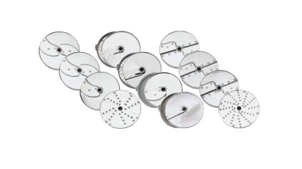 Набор из 16 дисков. Слайсеры 1,2, 4 мм; терки 1,5 и 3 мм; кубики 5 × 5х5, 10 × 10 × 10, 20 × 20 × 20 мм; фри 10 × 10 мм; соломка 2,5 × 2,5, 2 × 10, 4 × 4 мм; 4 шт. настенных держателя, комплект для очистки решеток D-Clean