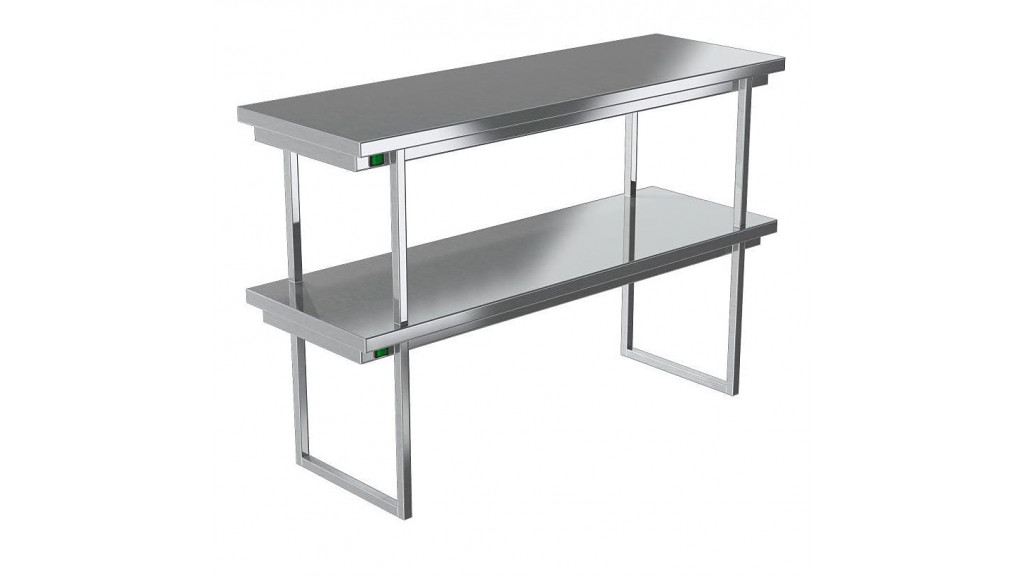 1200 × 300 × 800 мм; полка тепловая настольная разборная, 2 яруса, полки из нержавеющей стали марки AISI 430 толщиной 0,8 мм; каркас трубы 20 × 20 из нержавеющей стали марки AISI 430 толщиной 1,2 мм; мощность 2,4 кВт; поставляется в разобранном виде, вес: 11,3 кг.