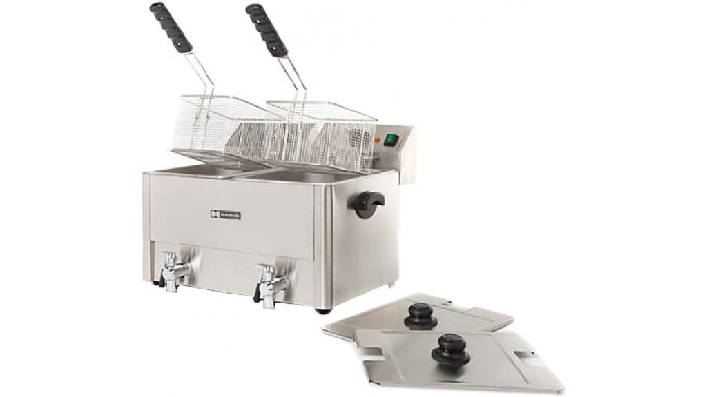 Настольная; электрическая; 2 нерж. ванны объёмом 8 л каждая; 2 корзины в комплекте; холодная зона; крышки в комплекте; краны для слива; темп. режим: 60–190 °C; электромеханическое управление; защита от перегрева; без таймера; 220 В; 6,5 кВт; 605 × 465 × 380 мм; 14,6 кг.