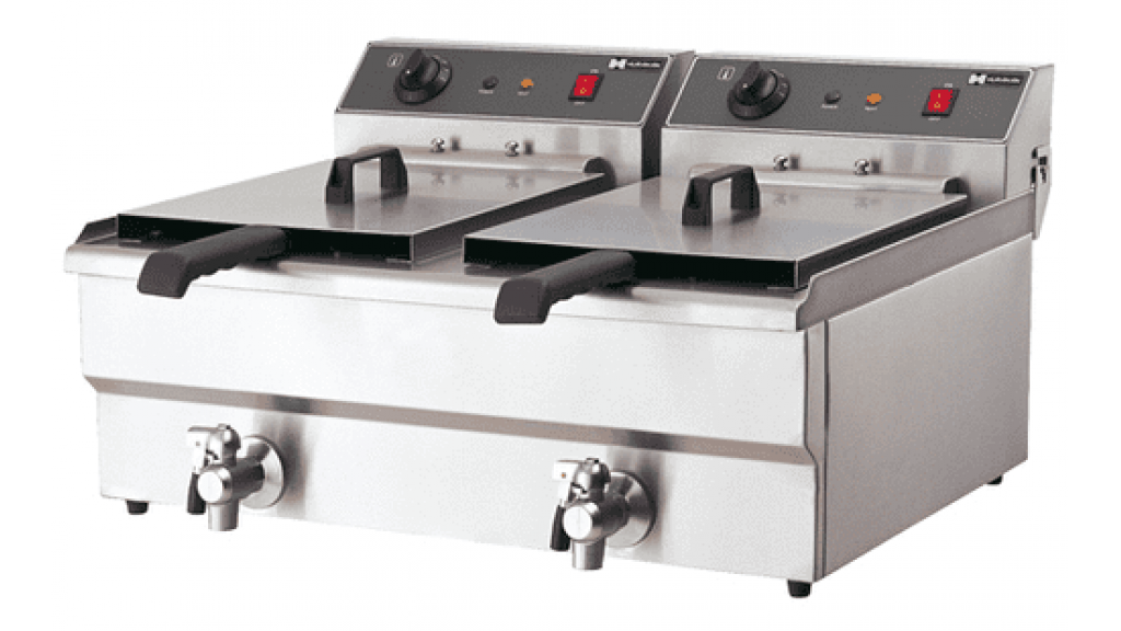 Настольная; электрическая; 2 нерж. ванны объёмом 10 л каждая; 2 корзины в комплекте; холодная зона; крышки в комплекте; краны для слива; темп. режим: 50–190 °C; электромеханическое управление; защита от перегрева; без таймера; 220 В; 8 кВт; 570 × 460 × 325 мм; 11 кг.