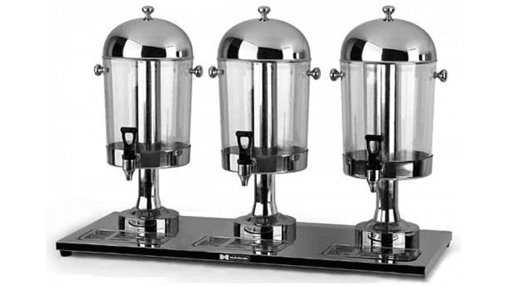 Диспенсер напитков Hurakan HKN-DB83 используется на предприятиях общественного питания для самостоятельного розлива охлажденных безалкогольных напитков посетителями. Прибор состоит из трех цилиндрических емкостей, установленных на подставке. Все элементы диспансера выполнены из нержавеющей стали.