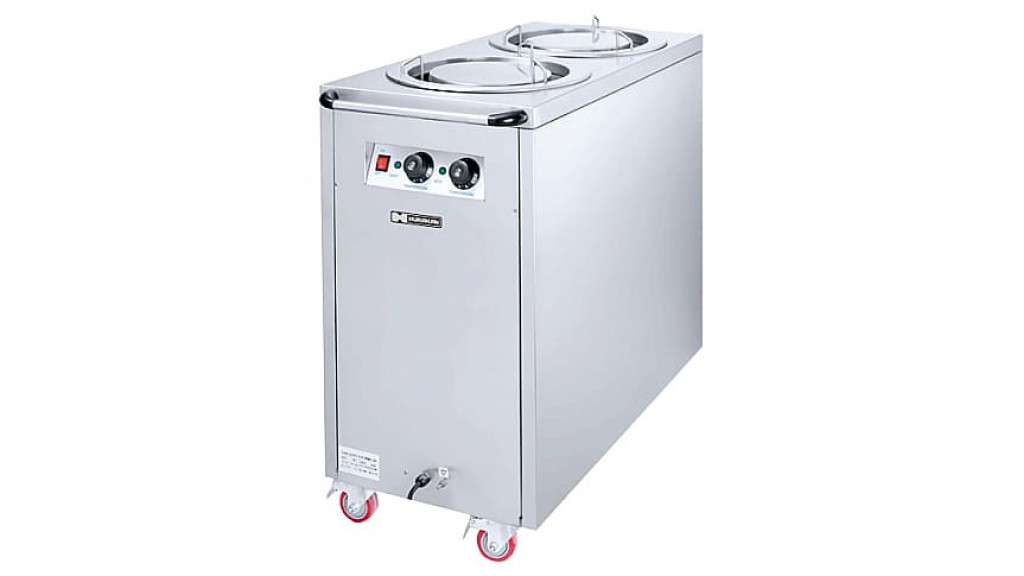 450 × 950 × 900 мм; 220 В; 0,4 кВт; 48 кг; две ёмкости для тарелок, диаметр тарелок: 245 … 300 мм; с колпаками на ёмкостях для тарелок, на колёсах, время нагрева до максимальной температуры: 7 … 8 мин.