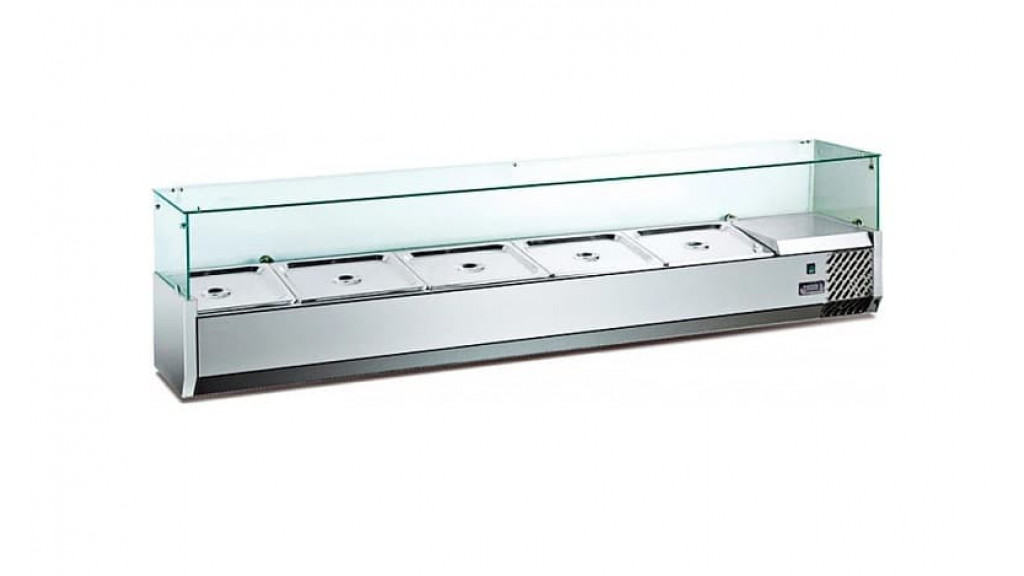 Витрина холодильная Hurakan HKN-VRX1200/330 используется на предприятиях общественного питания и торговли для демонстрации, охлаждения и кратковременного хранения закусок, салатов, ингредиентов для пиццы и других скоропортящихся продуктов.