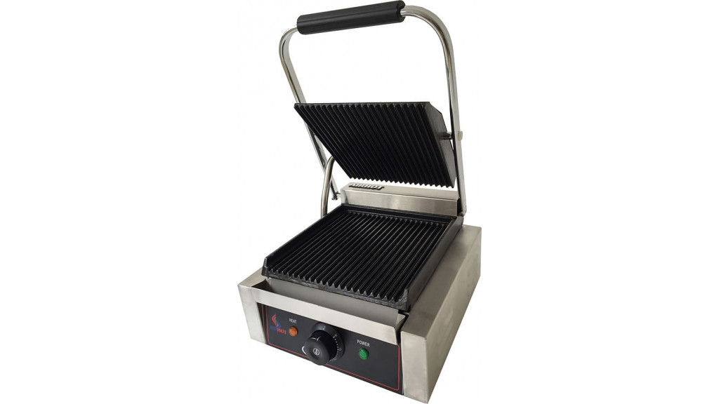 Одна зона нагрева; верхняя раб. поверхность: рифлёная, 220 × 230 мм; нижняя раб. поверхность: рифлёная, 220 × 230 мм; материал поверхностей: чугун; темп. режим: 50–300 °C; 220 В; 1,8 кВт; 400 × 300 × 210 мм; масса: 13,8 кг.