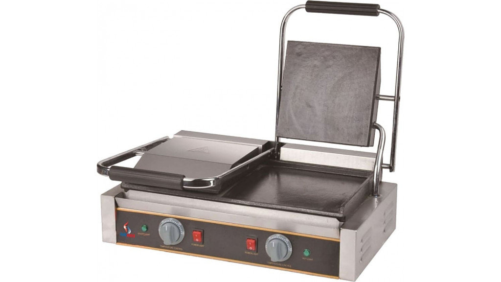 Две зоны нагрева; верхние раб. поверхности: раздельные, гладкие, 215 × 215 мм; нижняя раб. поверхность: совмещённая, гладкая, 496 × 277 мм; материал поверхностей: чугун; темп. режим: 50–300 °C; 220 В; 3,6 кВт; 580 × 400 × 210 мм; масса: 24 кг.